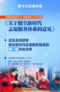 中共中央办公厅、国务院办公厅近日印发《关于健全新时代志愿服务体系的意见》,这是系统部署健全新时代志愿服务体系的第一份中央文件,对完善志愿服务制度和工作体系、促进志愿服务事业长远发展具有重要意义。