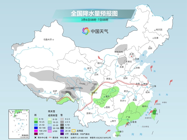 随着冷空气继续向南推进,今天(3月6日),北方的雨雪将大幅缩减,南方的阴雨范围也将有所收敛。明天,中东部此轮雨雪过程将趋于结束。不过紧接着,8日至10日,长江以南地区新一轮阴雨天气将自西向东发展起来。气温方面,今天,降温的重心将转移至江南、华南一带,尤其是华南地区,气温普遍冲高回落,前后冷暖反差较大。